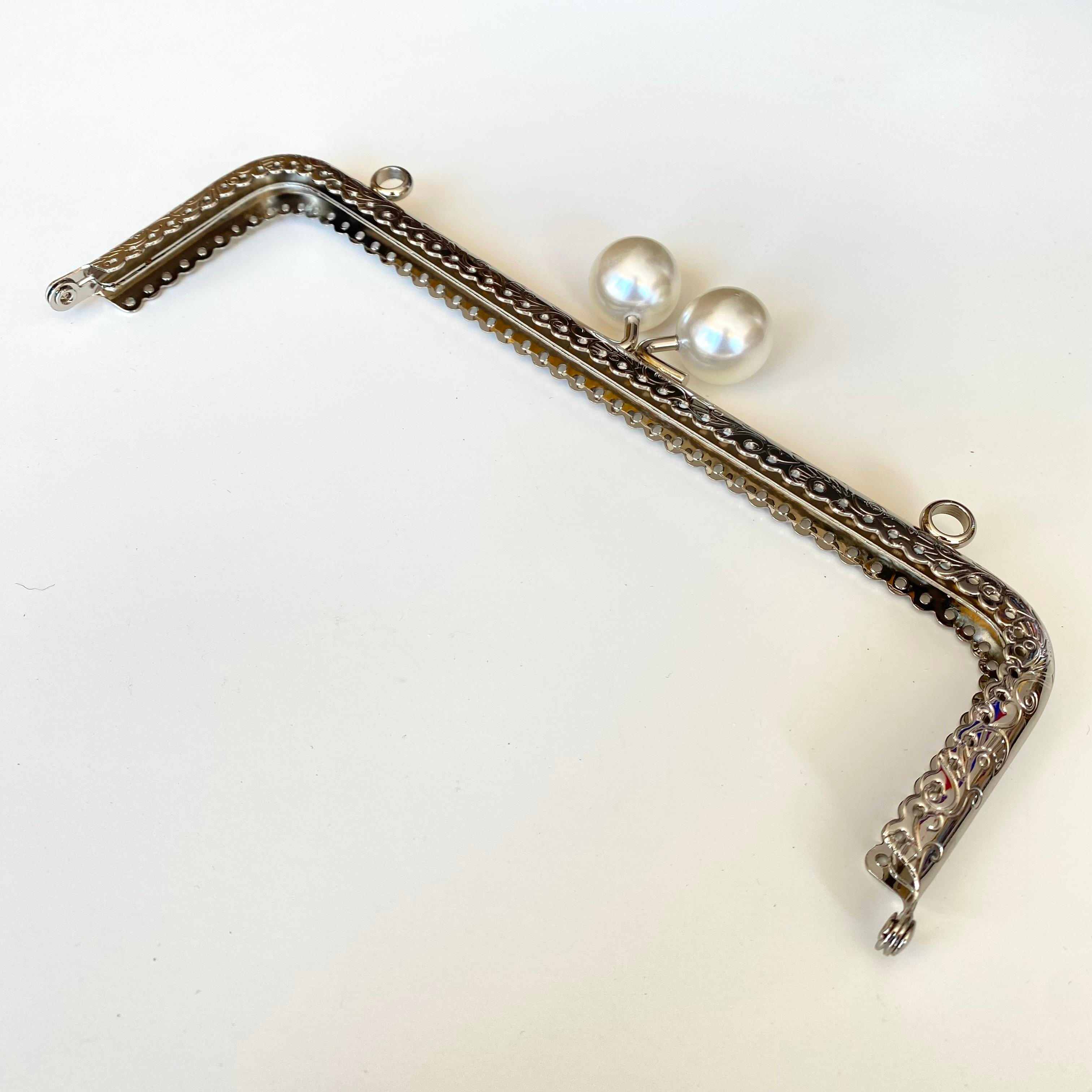 Köşeli Beyaz İnci Boncuklu İşleme Baskılı Askılıklı Çanta ve Cüzdan Bursu - Klipsi Gümüş 20.5 Cm BA-0111